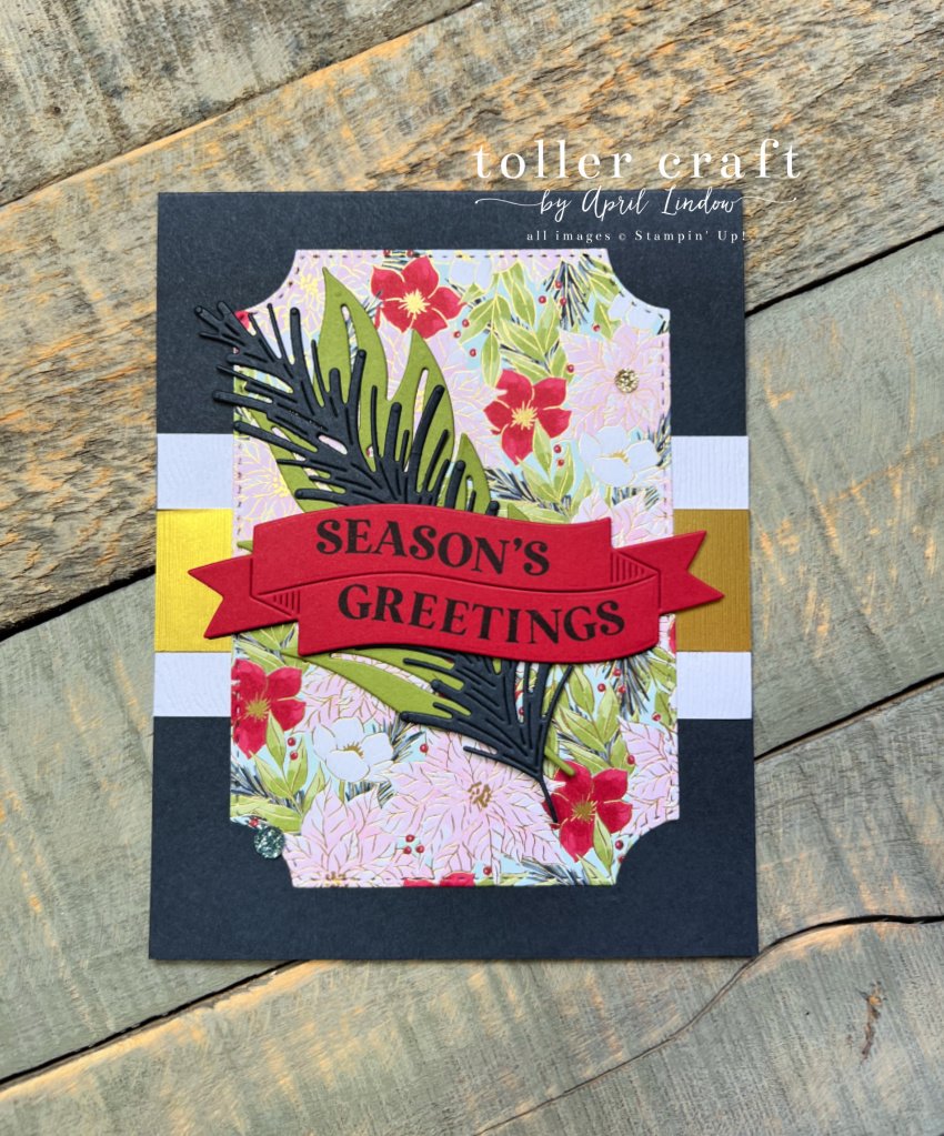 Today I am sharing one of my first cards I made with the Traditions of Christmas suite. For the strip of white I used the Wood Textured specialty paper. I layered over it the Textured Metallic foil in gold and then cut the beautiful Traditions of Christmas Designer Series Paper with the Branching Out Dies. This card is simple enough to make in multiples, and it is very pretty. This is likely to be one of my cards to share with my co-workers this year.