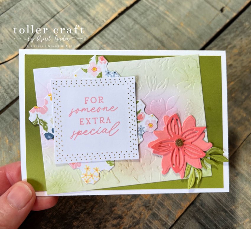I used blending brushes on the embossed card stock to add old olive and Pretty in Pink ink to create a background.